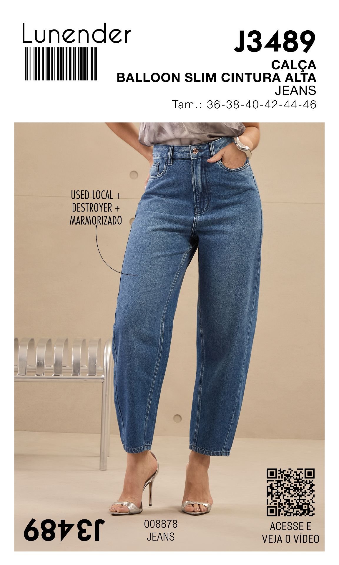 Jeans femeninos en denim azul de tiro alto y corte relajado, con acabado marmorizado y detalles destroyer que aportan un estilo moderno y urbano. Confeccionados en tela resistente y cómoda, ideales para looks casuales con actitud.